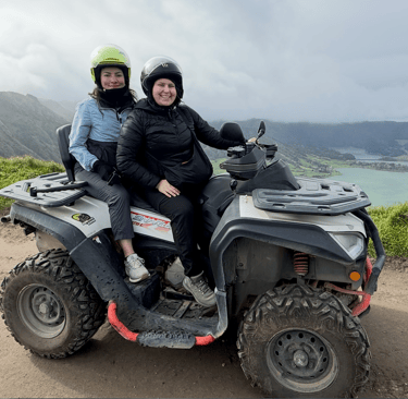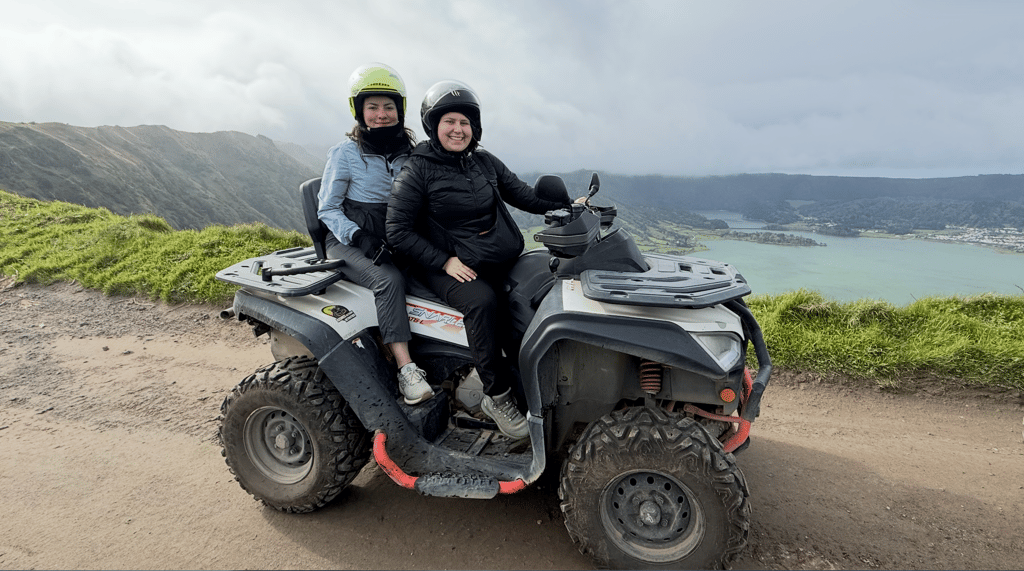 I drove first with Fern behind me and we made our way through the towns up toward the Sete Cidades mountain region. We stopped at a moss-covered aqueduct first, blanketed in fog and looking extremely Lord of the Rings, which was a fantastic start. From there we rode along the rim of the crater to various viewpoints, did some off-roading which felt genuinely wild because I was sincerely concerned I was going to send Fern flying, and took in scenery we never could have reached by car. I asked about switching drivers early on because I wanted Fern to have the full experience of both off-road and paved sections, but our guide said no, stay on, I'll let you know when — while also not seeming entirely convinced Fern could handle it. When we eventually reached the town it was Fern's turn, and the guide very earnestly reminded her multiple times that to stop, she needed to release the gas and press the brakes. Like, yes. We know. We made it back to the meeting point in one piece and Fern did get some driving in, even if the off-road portion was mostly mine. We both enjoyed it very much.