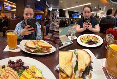 We arrived at Terminal E, much to Fern's dismay (there isn't a good lounge in Terminal E). First, the check-in counter made us check our bags even though they were under the weight limit, then they didn't put TSA PreCheck on our boarding passes. Fern found solace in her incoming Stella beer. Dun dun dun... they were sold out, so she had to settle for a way-too-bubbly Blue Moon. Just as she thought her day couldn't get any more disappointing, her turkey club without bacon came with bacon — melted into the cheese (not even removable). ***Can you tell we were both feeling a little crazy?***